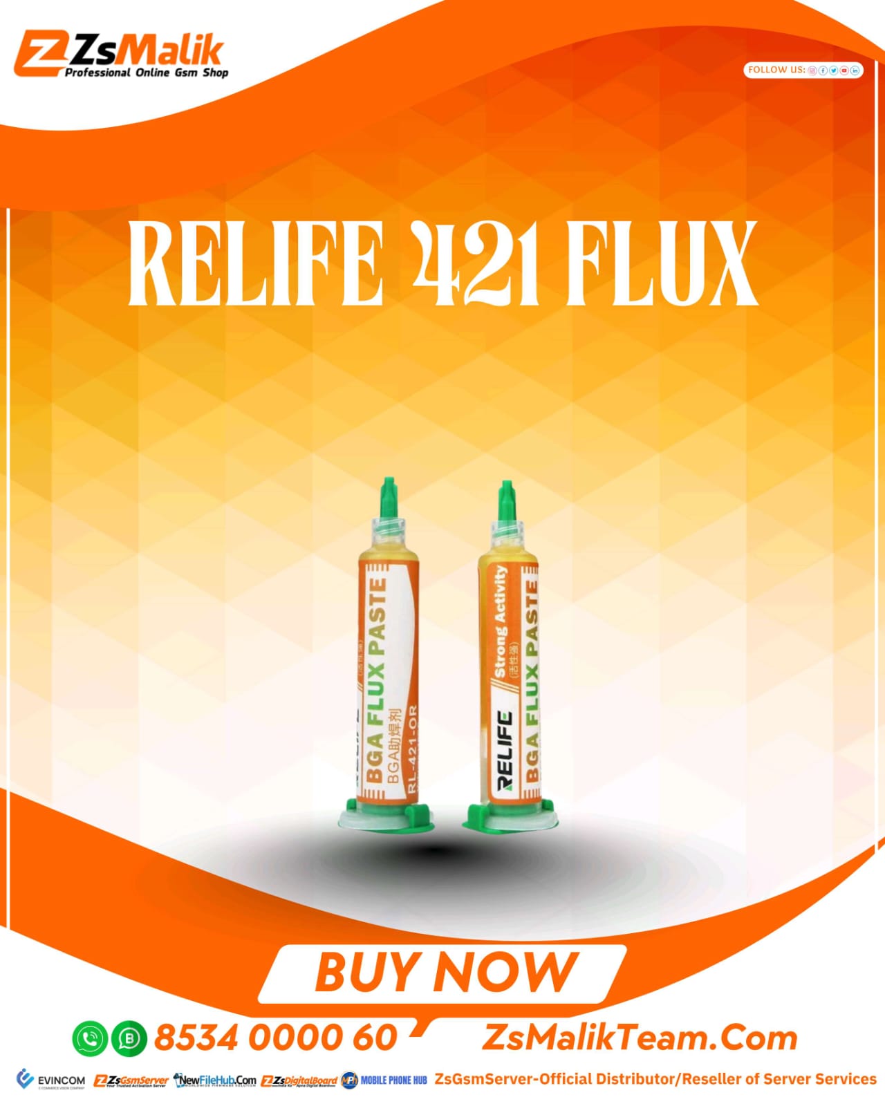 Professional Relife RL-421-OR Strong Activity BGA Flux Paste (10cc) for precise soldering, reballing, and PCB/BGA repair. High-viscosity no-clean flux that promotes excellent solder wetting and minimizes smoke.